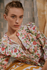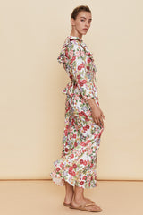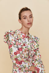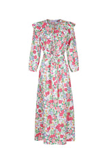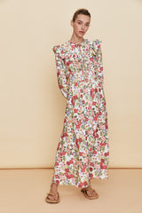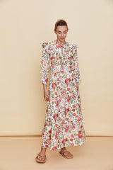 This mid-weight linen printed maxi dress has a ruffle neck and shoulder detail, gathered full balloon cuffed sleeves and self ties with covered buttons.