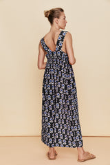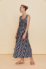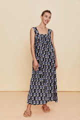 This silk printed sundress has a loose flowing silhouette, long midi length with wide shoulder strap detail and gathered neckline.