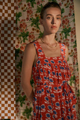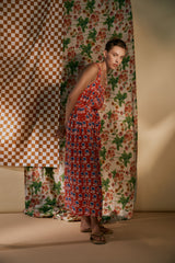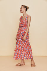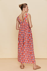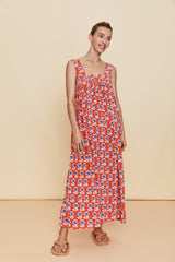 This silk printed sundress has a loose flowing silhouette, long midi length with wide shoulder strap detail and gathered neckline.