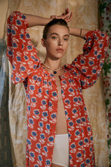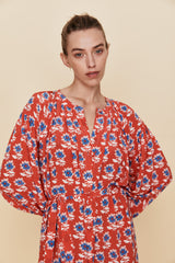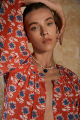 Our Marigold Red print features a blue and white floral motif design.