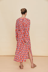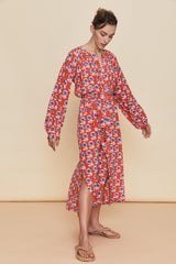 This silk printed midi dress has a loose flowing silhouette with side splits to the knee, gathered full balloon cuffed sleeves and a round neckline with a self tie.